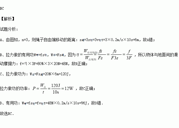 如图所示,重300N的物体在20N的水平拉力F的作用下,以0.2m/s的速度沿水平地面向左匀速直线运动了10s,滑轮组的机械效率为80%,则在此过程中。下列说法正确的是