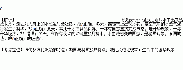 A. 游泳后,从水中出来感觉较冷,是由于水蒸发时吸热