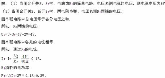 (2) (4分)当闭合开关S,断开S1时,电压表示数为2V,求通过R1的电流和R1消耗的电功率?
