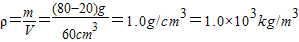 解答:解:观察图象可知:当体积为0时质量是20g,所以烧杯质量为20g;当体积为60cm3时质量为80g,液体质量为(80-20)g