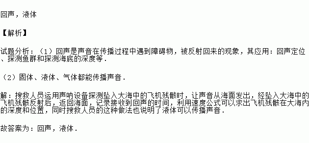 回声,液体 【解析】 试题分析:(1)回声是声音在传播过程中遇到障碍物,被反射回来的现象,其应用:回声定位、探测鱼群和探测海底的深度等. (2)固体、液体、气体都能传播声音. 【解析】 搜救人员运用声呐设备探测坠入大海中的飞机残骸时,让声音从海面发出,经坠入大海中的飞机残骸反射后,返回海面,记录接收到回声的时间,利用速度公式可以求出飞机残骸在大海内的深度和位置,同时搜救人...