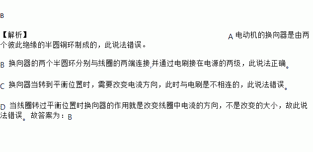 B ¡¾½âÎö¡¿A µç¶¯»úµÄ»»ÏòÆ÷ÊÇÓÉÁ½¸ö±Ë´Ë¾øÔµµÄ°ëԲͻ·ÖƳɵ쬴Ë˵·¨´íÎó¡£ B »»ÏòÆ÷µÄÁ½¸ö°ëÔ²»··Ö±ðÓëÏßȦµÄÁ½¶ËÁ¬½Ó,²¢Í¨¹ýµçË¢½ÓÔÚµçÔ´µÄÁ½¼¶£¬´Ë˵·¨ÕýÈ·¡£ C »»ÏòÆ÷µ±×ªµ½Æ½ºâλÖÃʱ£¬ÐèÒª¸Ä±äµçÁ÷·½Ïò£¬´ËʱÓëµçË¢ÊDz»ÏàÁ¬µÄ£¬´Ë˵·¨´íÎó¡£ D µ±ÏßȦת¹ýƽºâλÖÃʱ»»ÏòÆ÷µÄ×÷ÓþÍÊǸıäÏßȦÖеçÁ÷µÄ·½Ïò£¬²»ÊǸıäµÄ´óС£¬¹Ê´Ë˵·¨´íÎ󡣹ʴð°¸Îª£ºB