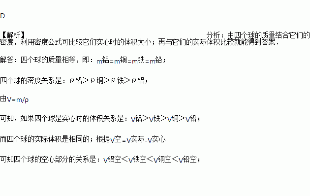 四个等体积等质量的空心小球,它们分别是铅、铜、铁和铝做成的,/。其空心部分的体积最大的是( )。