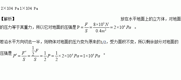 放在水平地面上的一个立方体的重力为8×103N,底面积为0.4m2,它对地面的压强是___________Pa,若沿水平方向切去一半,则剩余部分对地面的压强是___________Pa。