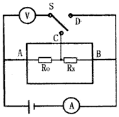 如图所示,电学黑箱中有两个电阻,已知定值电阻R0=8Ω,另一个为未知电阻Rx,由箱内抽出三根引线A、B、C,当开关S与C闭合时,电流表的示数为1A,电压表示数8V;当开关S与D闭合时,电流表示数为1A,电压表的示数为10V。