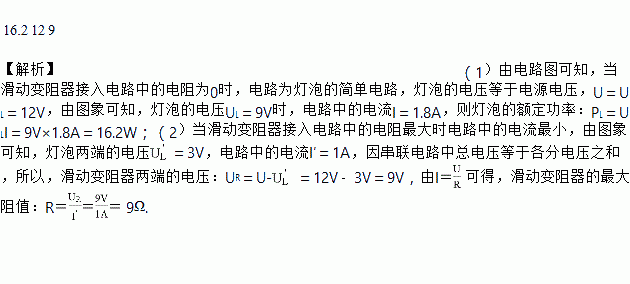 如图甲所示,电源电压保持不变,小灯泡的额定电压为9V,闭合开关S后,当滑片P 从R的一端滑到另一端的过程中,小灯泡的I-U关系图象如图乙所示。则小灯泡的额定功率 为____________W,电源电压为_____________V、滑动变阻器的最大阻值为____________。