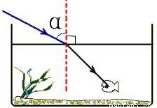 (2)当光由空气斜射进入水中时,折射光线向法线偏折,折射角小于入射角,用α标出入射角,如图: