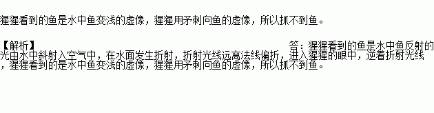 为了捕捉到一条鱼,猩猩用矛对准看到的鱼拼命地刺向水里却没有成功,请你说明其中的物理道理。
