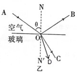 现象.一束红光沿AO从空气斜射向玻璃,OB和OC分别是红光的反射光线和折射光线,如图乙所示.如果一束紫光也沿A0斜射向玻璃,请你在图乙中画出该紫光的折射光线(大致位置)和反射光线,并标出传播方向.