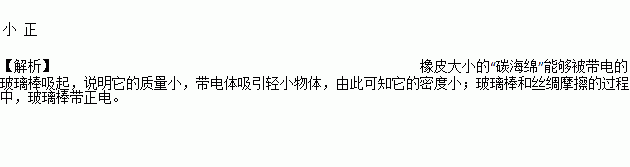 如图所示,丝绸摩擦过的玻璃棒能将一块橡皮大小且不带电的“碳海绵”吸起,这说明了“碳海绵”的密度____(选填“大”或“小”),该玻璃棒带____电.