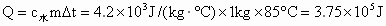 答:水吸收的热量是 本题考查的是热量的计算.①气压为标准大气压,水的沸点应是 100℃,可根据Q=cmΔt来计算.②由热水壶的热效率是85%,说明电热水壶放出的热量有85%被水吸收,可列出下列等式 |