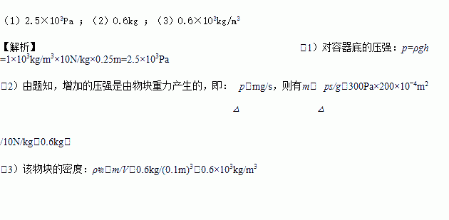 (2)若在水中放入一边长为0.1m的正方形物块,得容器对水平桌面的压强增加了300Pa, 则该物块的质量为多大