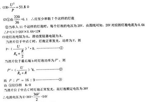 (3)另有一只灯泡只能看清其铭牌上的额定电压为36V,将其接入如图乙所示电路中,当闭合开关S,滑动变阻器滑片位于中点C时灯泡正常打光,此时灯泡的电功率为P,当滑片位于最右端b时,灯泡实际电功率为P’,已知P:P’=16:9,求所接电源电压U为多少伏?(灯泡的电阻始终不变)