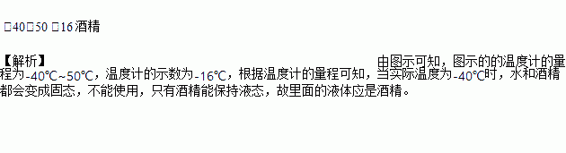 2016年春节,小明去北方看雾凇,在公园看到温度计如图所示,其量程为________℃,当时气温为________℃,温度计内测温液体是表格中的________。