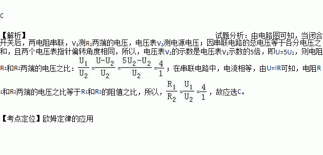 在如图所示电路中,当闭合开关后,两个电压表指针都向右偏转相同角度,则电阻R1和R2阻值之比为( )