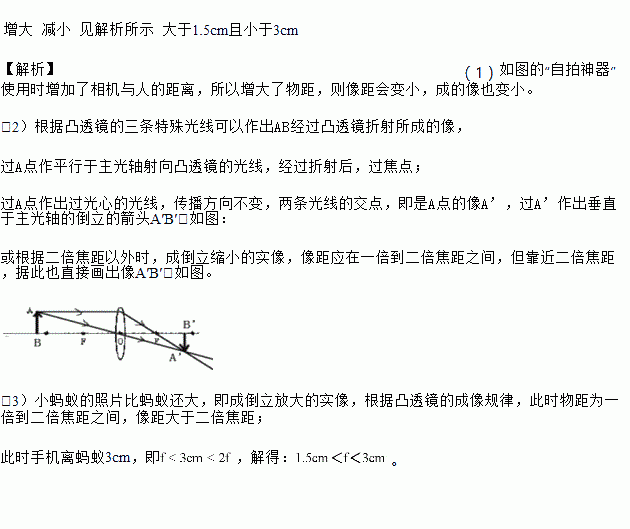 增大 减小 见解析所示 大于1.5cm且小于3cm 【解析】(1)如图的“自拍神器”使用时增加了相机与人的距离,所以增大了物距,则像距会变小,成的像也变小。 (2)根据凸透镜的三条特殊光线可以作出AB经过凸透镜折射所成的像, 过A点作平行于主光轴射向凸透镜的光线,经过折射后,过焦点; 过A点作出过光心的光线,传播方向不变,两条光线的交点,即是A点的像A’,过A’作出垂直于主...