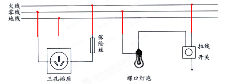 带保险丝的三孔插座单独接入;②开关控制电灯后接入。