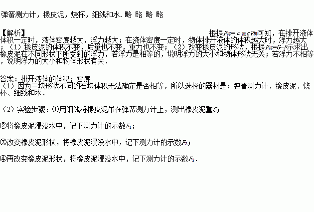 ¹©Ñ¡ÔñµÄÆ÷²Ä£ºµ¯»É²âÁ¦¼Æ£¬Èý¸öÐÎ×´²»Í¬µÄСʯ¿é£¬ÏðƤÄ࣬ÉÕ±£¬Ï¸ÏߺÍË®.