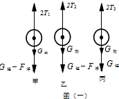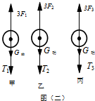 动滑轮2对动滑轮1的拉力为T2,出水后动滑轮2对动滑轮1的拉力为T3,受力分析如图(一)甲、乙、丙所示.n=2