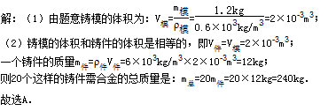 一个铸模由密度为0.6×103kg/m3的实心木质材料制成,质量为1.2kg,用密度为6×103kg/m3的合金浇铸20个这样的铸件需合金的总质量是