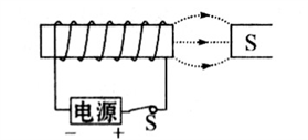 如图,闭合开关S 后,通过螺线管与磁极间的磁感线形状如图所示,在图中用箭头标出磁感线的方向,并用“+”、“-”号标出电源的正、负极.