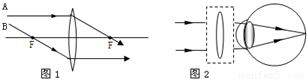 (1)请在图1中画出入射光线A、B经过凸透镜后的折射光线.(2)请在图2的方框内画出矫正远视眼所需的透镜.