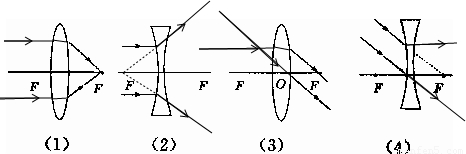 (3)凸透镜中,折射光线过焦点,则入射光线与主光轴平行,过光心的光线经凸透镜折射后传播方向不改变.