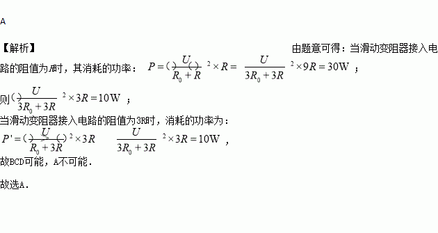 如图,当滑动变阻器接入电路电阻的阻值为 R 时,其消耗的功率是30 W;当接入电路电阻的阻值为3 R 时,其消耗的功率不可能是 ( )