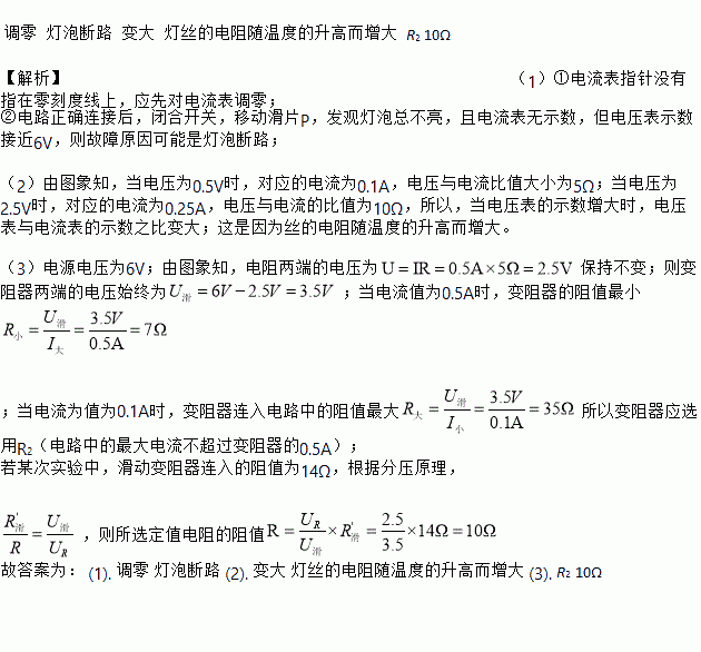 调零 灯泡断路 变大 灯丝的电阻随温度的升高而增大 R2 10Ω 【解析】(1)①电流表指针没有指在零刻度线上,应先对电流表调零; ②电路正确连接后,闭合开关,移动滑片P,发观灯泡总不亮,且电流表无示数,但电压表示数接近6V,则故障原因可能是灯泡断路; (2)由图象知,当电压为0.5V时,对应的电流为0.1A,电压与电流比值大小为5Ω;当电压为2.5V时,对应的电流为0.25A,电压与电...