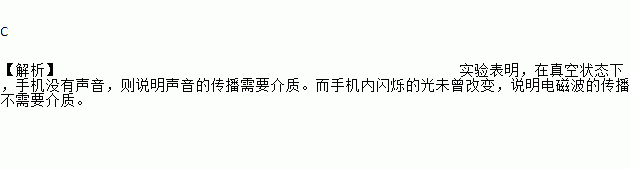 C 【解析】实验表明,在真空状态下,手机没有声音,则说明声音的传播需要介质。而手机内闪烁的光未曾改变,说明电磁波的传播不需要介质。