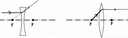【答案】分析:作凸透镜或凹透镜的光路图时,首先要仔细观察入射光线的特点,然后再根据透镜的光学特点来作图.