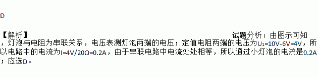 D 【解析】试题分析:由图示可知,灯泡与电阻为串联关系,电压表测灯泡两端的电压;定值电阻两端的电压为U1=10V-6V=4V,所以电路中的电流为I=4V/20Ω=0.2A,由于串联电路中电流处处相等,所以通过小灯泡的电流是0.2A;应选D。