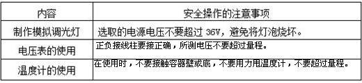 | 在进行科学探究活动的过程中,要特别注意安全问题。为此,小华以表格的形式将物理实验中应注意的安全问题整理出来。现请你帮小华完成表中的空白部分。 | ||||||||