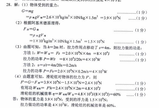 某工程队在一次水下施工作业中,用如图20所示的滑轮组将浸没在河底的实心物体从深水中吊起。物体的密度为2.6×103kg/m3,体积是1.5m3,所用的拉力F是2.0×104N,物体在20s内匀速上升了2m(未露出水面),不计水的阻力。求: