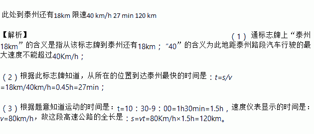 此处到泰州还有18km 限速40 km/h 27 min 120 km 【解析】(1) 通标志牌上“泰州18km”的含义是指从该标志牌到泰州还有18km; “40”的含义为此地距泰州路段汽车行驶的最大速度不能超过40Km/h; (2)根据此标志牌知道,从所在的位置到达泰州最快的时间是:t=s/v=18km/40km/h=0.45h=27min; (3)根据题意知道运动的时间是:t...