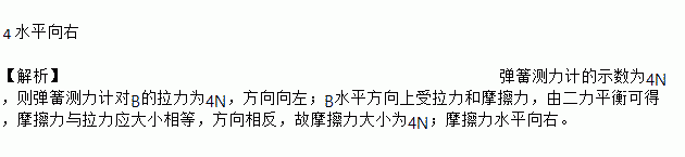 ÈçͼËùʾ£¬ÓÃF£½6NµÄˮƽÏòÓÒµÄÀÁ¦ÔÈËÙÀ¶¯Îï¿éAʱ£¬Îï¿éB¾²Ö¹²»¶¯£¬´Ëʱµ¯»É²âÁ¦¼ÆµÄʾÊýΪ4N£¬ÔòÎï¿éBËùÊÜĦ²ÁÁ¦µÄ´óСΪ_______N£¬Ä¦²ÁÁ¦µÄ·½ÏòΪ_______________¡£