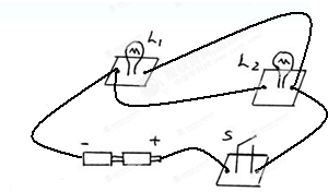 解:采用“电流流向法”,电流从电源正极出发,依次串联开关S、灯泡L2串联起来,再将灯泡L1分别并联在灯泡L2的两端即可,如下图所示: