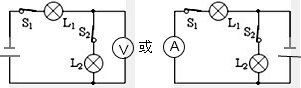 (3)如果电源在左侧,则右侧必须是电压表,否则其中一个灯泡将被短路,此时两灯泡串联;如果电源在右侧,则左侧为电流表,两灯泡并联.