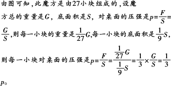 2009年春晚的《盲拧魔方》节目使很多同学喜欢上了这种智力玩具.如图所示,将一个魔方放在水平桌面上,它对桌面的压强为p,若将魔方拆开,取其中的一块放置在水平桌面上,则这一块对桌面的压强为