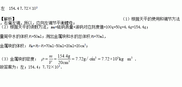 如图所示,用天平和量筒测金属块的密度.将托盘天平放在水平台面上.在调节托盘天平横梁平衡时,发现指针偏向分度盘中央刻度线的右侧,应将天平右侧的平衡螺母向______调节(选填“左”或“右”).将金属块放在已调好天平的左盘中,当天平平衡时,右盘中的砝码及游码在标尺上的位置如图甲所示,则金属块的质量是______g.把金属块放在装有50mL水的量筒中,量筒内水面的位置如图乙所示,则金属块的密度是______kg/m3.