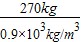得:m=ρv=1.0×103kg/m3×0.27m3=270kg.