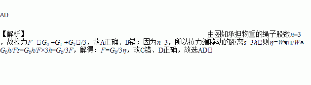 某建筑工地上,工人师傅用滑轮组和桶组成的装置将水泥从地面匀速运至楼上,如图所示,若水泥重为G0,桶重为G1,动滑轮重为G2,不计绳重和摩擦,此过程中该装置的机械效率为η,则工人师傅作用在绳子自由端的拉力F为( )