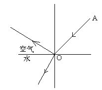 (3分)图中AO是由空气向水面斜射的一条光线。在图中画出反射光线及折射光线的大致方向,并用箭头标明它们的传播方向。