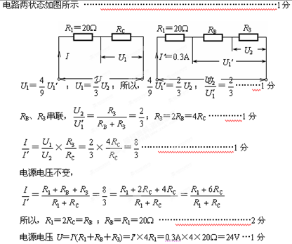 在下图所示电路中,电源电压一定。电阻R1=20W。当开关S闭合,滑动变阻器的滑片P在中点C时,电压表V1示数为U1;当开关S断开,再将滑片P调至B端,电压表V1示数为U1¢,电压表V2示数为U2,电流表示数为0.3A。若U1∶U1¢=4∶9,U1∶U2=2∶3。![]()