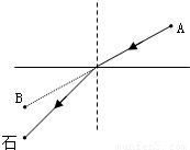 点评:本题考查了光的折射定律,是一道光学作图的基础题型.注意法线要用虚线,折射点与B之间也要用虚线.
