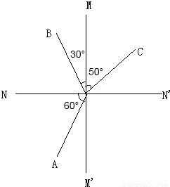 (2)因为是光在空气和玻璃两种介质中传播的情形,当光线是从空气斜射入玻璃中的时候,折射角小于入射角,则∠CON′=90°-50°=40°