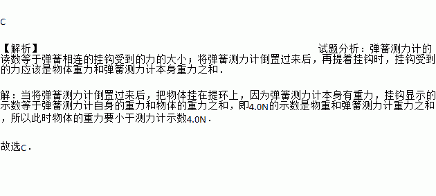 C ¡¾½âÎö¡¿ÊÔÌâ·ÖÎö£ºµ¯»É²âÁ¦¼ÆµÄ¶ÁÊýµÈÓÚµ¯»ÉÏàÁ¬µÄ¹Ò¹³Êܵ½µÄÁ¦µÄ´óС£»½«µ¯»É²âÁ¦¼Æµ¹ÖùýÀ´ºó£¬ÔÙÌá׏ҹ³Ê±£¬¹Ò¹³Êܵ½µÄÁ¦Ó¦¸ÃÊÇÎïÌåÖØÁ¦ºÍµ¯»É²âÁ¦¼Æ±¾ÉíÖØÁ¦Ö®ºÍ£® ¡¾½âÎö¡¿ µ±½«µ¯»É²âÁ¦¼Æµ¹ÖùýÀ´ºó£¬°ÑÎïÌå¹ÒÔÚÌá»·ÉÏ£¬ÒòΪµ¯»É²âÁ¦¼Æ±¾ÉíÓÐÖØÁ¦£¬¹Ò¹³ÏÔʾµÄʾÊýµÈÓÚµ¯»É²âÁ¦¼Æ×ÔÉíµÄÖØÁ¦ºÍÎïÌåµÄÖØÁ¦Ö®ºÍ£¬¼´4.0NµÄʾÊýÊÇÎïÖØºÍµ¯»É²âÁ¦¼ÆÖØÁ¦Ö®ºÍ£¬ËùÒÔ´ËʱÎïÌåµÄÖØÁ¦ÒªÐ¡ÓÚ²âÁ¦¼ÆÊ¾Êý4.0N...