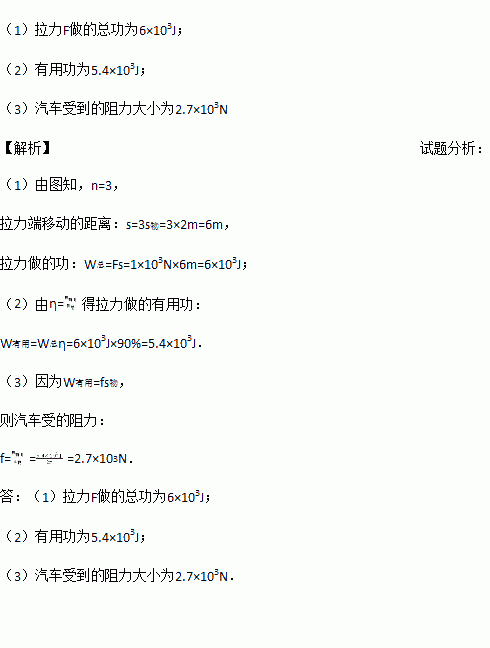 一辆质量是3.5×103kg的汽车不慎陷入泥泞地面,汽车司机组织人们用如图所示的滑轮组将汽车拖出.已知整个过程中,水平拉力F是1×103N,汽车沿水平方向匀速移动了2m,滑轮组的机械效率为90%.求: