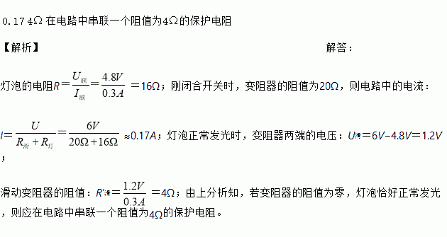 在“设计和制作一个模拟调光灯”的综合实践活动中,小明设计的电路图如图所示,已知电源电压为6V,小灯泡上标有“4.8V 0.3A”字样,滑动变阻器的规格是“20Ω 1A”. 假设小灯泡灯丝电阻固定不变,他正确连接电路且操作规范后闭合开关,此时电路中的电流是____A,移动滑动变阻器的滑动片,当灯泡正常发光时,滑动变阻器接入电路的阻值为____Ω,该电路不足是当滑动变阻器接入电阻过小时,会烧坏灯泡,对此你改进的措施是___。