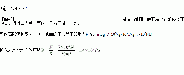为纪念建军90周年,我市决定在湖滨公园建造一尊石雕军人像,其中石雕像和基座的总质量为7×105kg,基座底部呈正方形,面积约为50m2,其中基座与地面接触面积比石雕像底面积大的原因是为了_______压强,整座石雕像和基座对水平地面的压强是_______Pa.